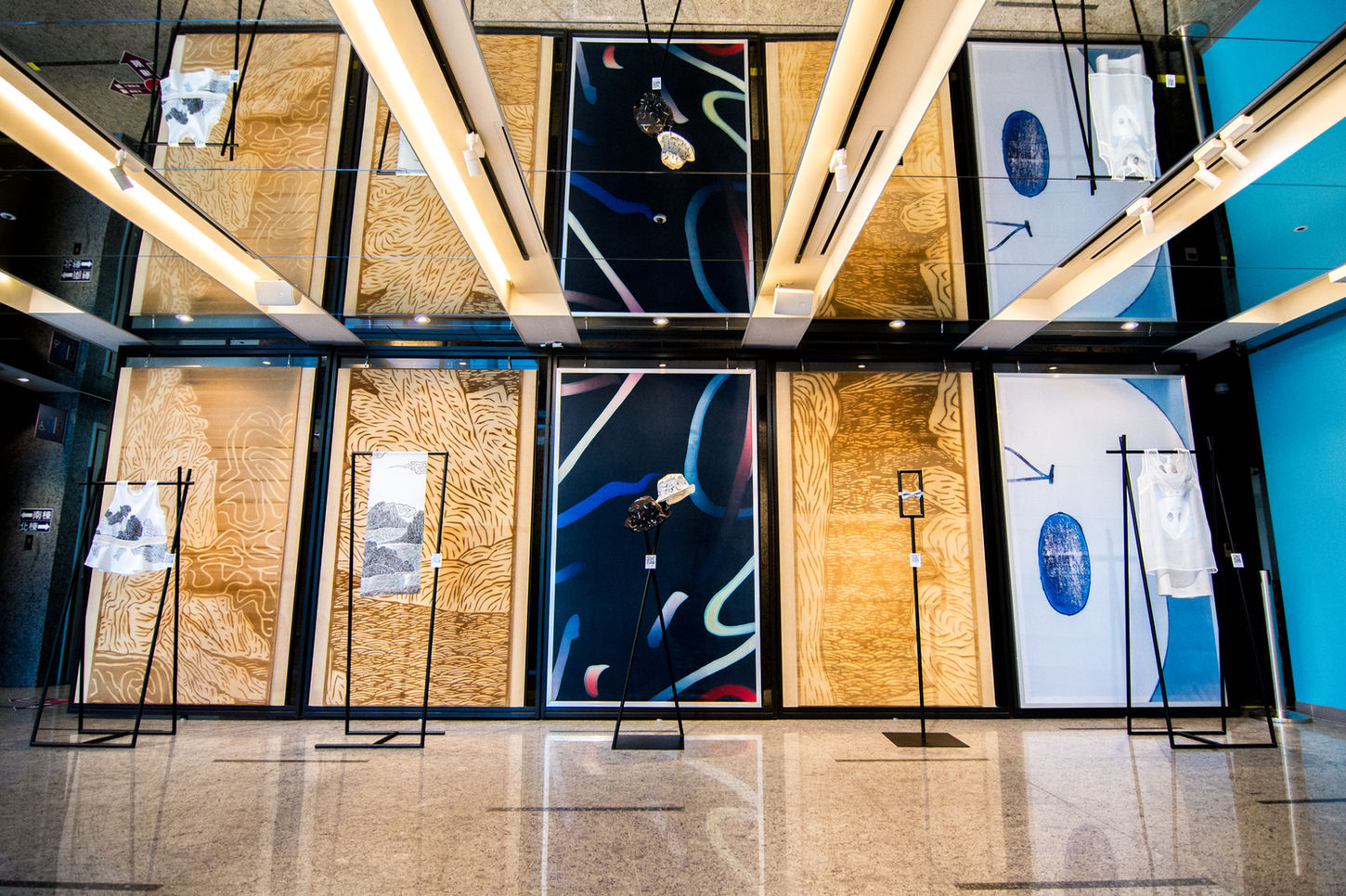 其中,張永村的作品「藍色小屋」作為此次展覽中的重點作品,我們在展場中央專門為此作品搭建了一座小屋,運用霓虹透明壓克力材質,通過前後擺放的視覺差異以及不同尺寸的對比,營造出具有深度和層次感的空間效果,呼應了原作的視覺特徵。這樣的設計不僅突顯了「藍色小屋」的獨特性,也在整體展覽中為觀者提供了一個具有互動性和沉浸感的觀展體驗。